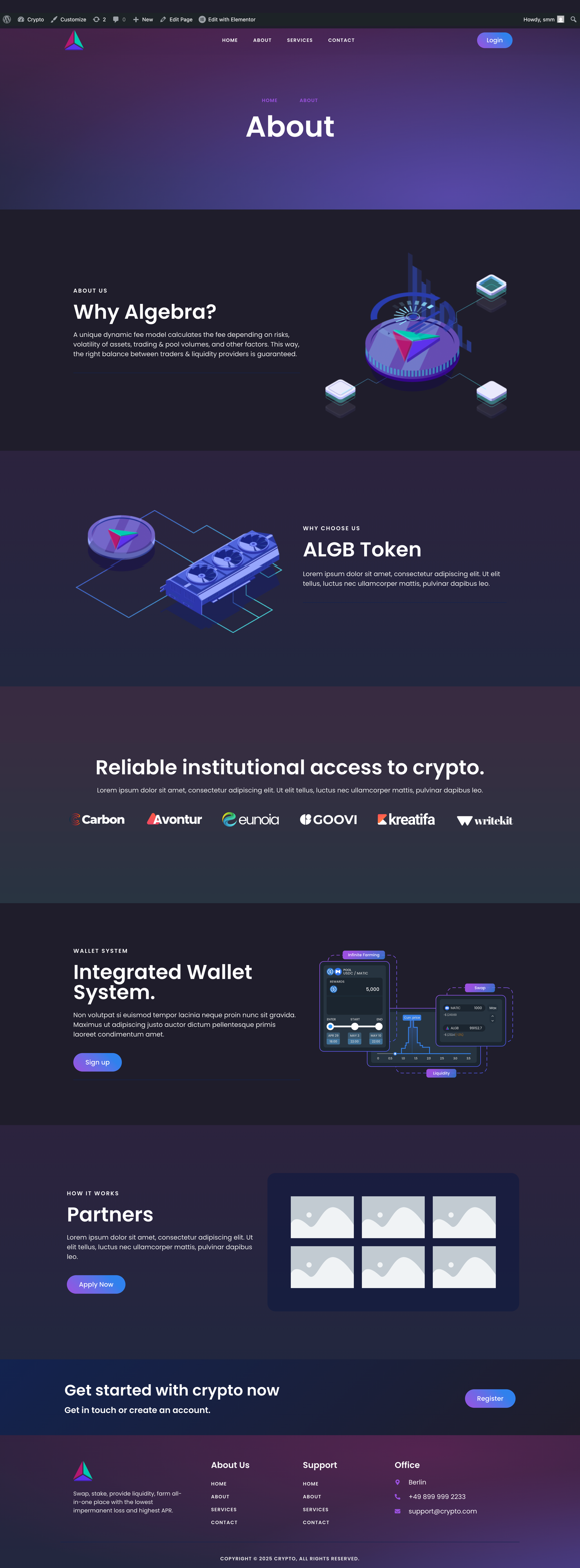 Launch3 is a powerful and modern cryptocurrency WordPress Elementor template created for crypto startups, token launches, blockchain platforms, and ICO or IDO campaigns. Designed with a futuristic UI and strong visual hierarchy, this template helps you present your project clearly, communicate value instantly, and build trust with early investors. Whether you want to introduce a new coin, promote a decentralized app, or develop a full crypto ecosystem, this layout delivers everything needed for a professional online presence.