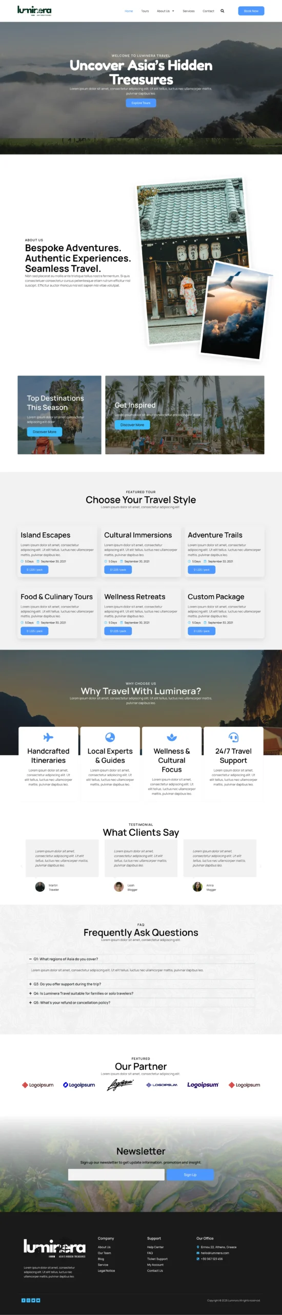 Whether you promote cultural tours in Japan, beach escapes in Thailand, or food experiences in Bali, this Asia travel Elementor template helps you present your services clearly and professionally. Ultimately, Lumirae supports your travel brand by improving trust, user experience, and conversions.