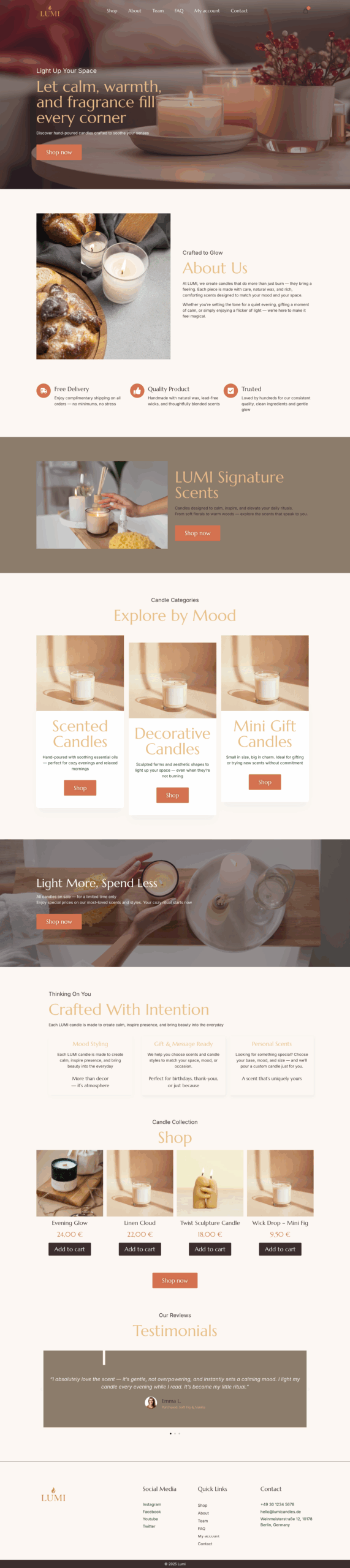 Luniq is a warm and elegant template created for candle shops, fragrance makers, and small artisan brands. It combines soft colors, clean lines, and clear structure. As a result, your products become the main focus from the moment a visitor enters your store. Luniq feels calm, modern, and very easy to browse.