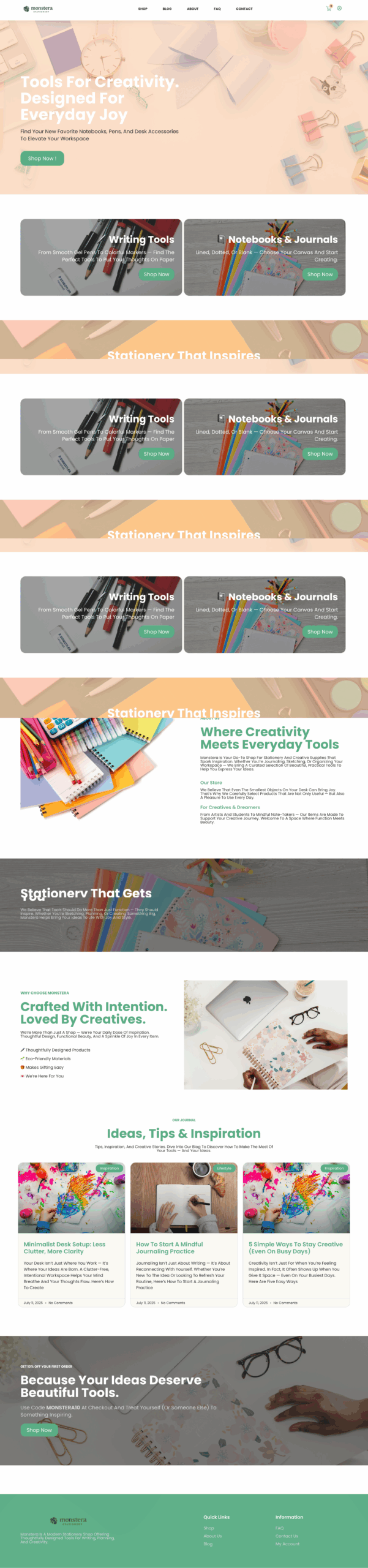 Monstio is suitable for selling sketchbooks, brushes, craft kits, markers, design tools, digital downloads, calligraphy sets, planners, scrapbooking materials, and other creative supplies. The template uses a clear visual structure that highlights key products. In addition, balanced spacing and clean typography guide visitors naturally through your catalog.