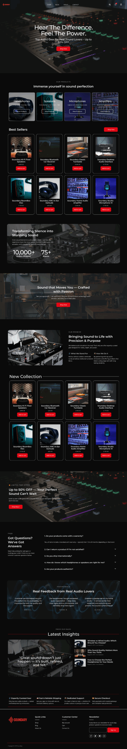Sonexa also offers pre-designed sections for featured products, reviews, deals, warranties, and brand highlights. As a result, customers can quickly compare gear, explore categories, and complete purchases with confidence. The dark interface adds a premium touch that enhances the presentation of headphones, speakers, amplifiers, turntables, and studio equipment.