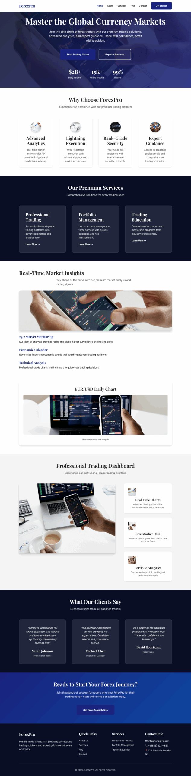 Fully responsive and easy to customize, the template includes essential sections such as Market Insights, Services, Testimonials, and Contact. Whether you’re running an online trading service or launching a financial education platform, this template offers a solid foundation for your web presence.